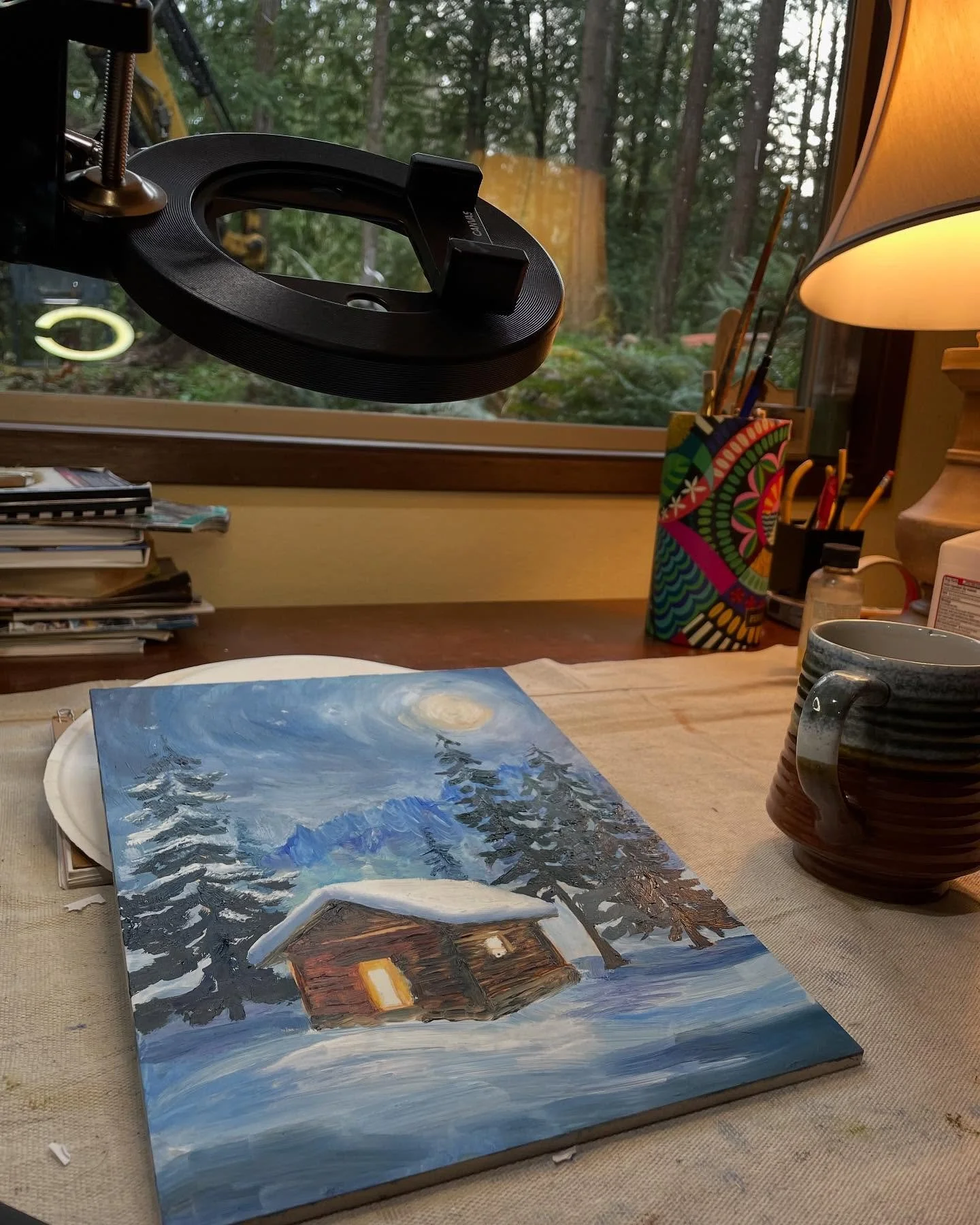 Wherever she goes, Margaret works hard to spread the joy of painting and to add beauty to the world. She moved to Bellingham, Washington in May of 2024, and in addition to developing a new body of work, Margaret is working as an Apprentice Carpenter, learning an entirely new range of skills.