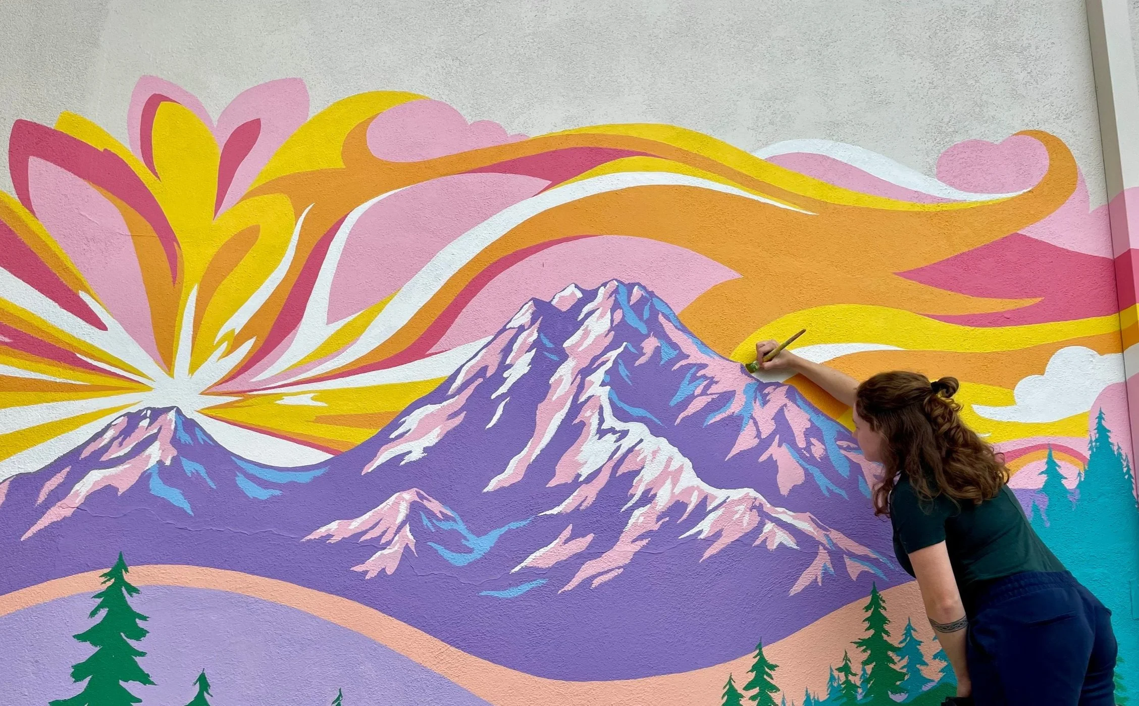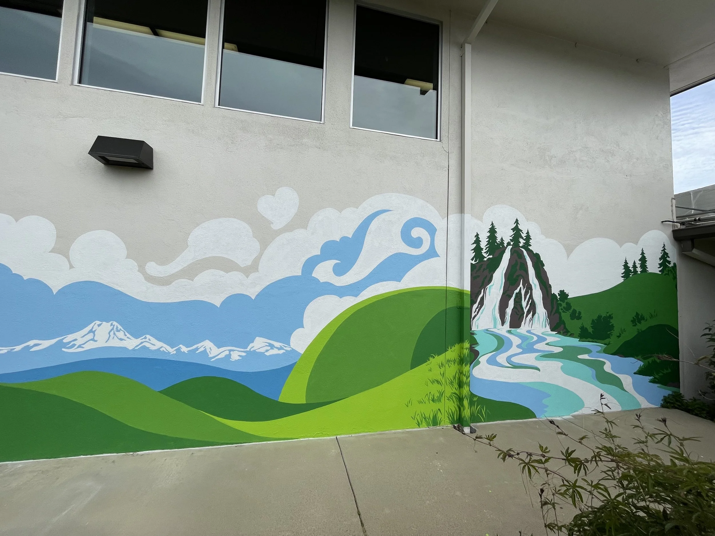 This mural honors the stunning views and expansive skyline of the Redding Valley. The art features the prominent Mount Shasta, the rolling hills of Millville Plains, the signature silhouette of Mount Lassen, and the beautiful Burney Falls. The layout of this mural represents the east-to-west journey of these landmarks.